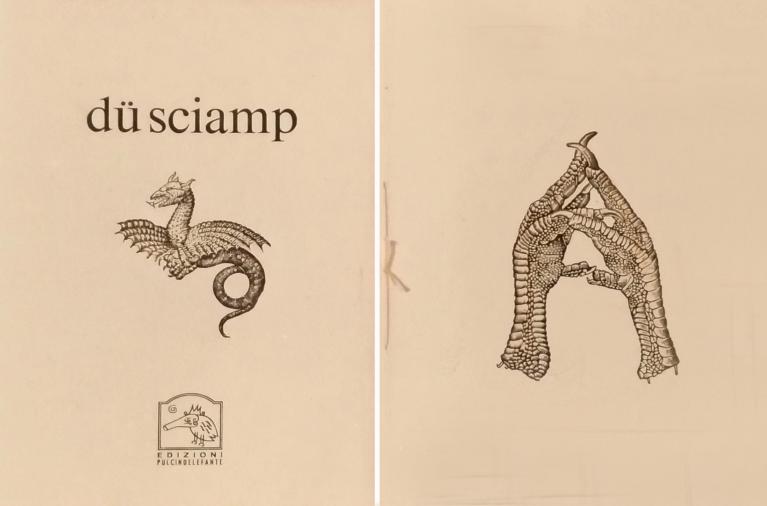 Un libretto Pulcinoelefante che comunica bene questa dinamica del senso e al tempo stesso anche lo spirito giocoso di Alberto è un libretto stampato in 25 esemplari nel 2010. Per assonanza fonetica, con un passaggio dalla lingua francese al dialetto brianzolo, il nome dell’artista dadaista “Duchamp” diventa “dü sciamp” che significa “due zampe”. È il titolo di un breve componimento dialettale con il quale Alberto celebra lo scampato pericolo delle galline dalla minaccia di far buon brodo: “finirö maj de vurèc ben aj gaên che scapen del bröt – non finirò mai di voler bene alle galline che scappano dal brodo”. Il testo è accompagnato da un disegno di Luciano Ragozzino, inciso da Adriano Porazzi: due zampe dell’animale raccolte in una posa devota che potrebbe significare “grazie a Dio sono salva!”. Le zampe sono infatti sezionate come i particolari anatomici ex voto esposti nelle chiese. C’è qualcosa di aristocratico oltre che di devozionale in questa immagine. Le grinfie e la texture grafica di un drago stampato in copertina conferiscono infatti per associazione visiva alle zampe della gallina un che di araldico. Immagini araldiche e figurative si combinano tra loro e con altri simboli grafici e segni fonetici generando tensione tra ciò che è linguistico e ciò che non lo è. Sul piano della composizione tipografica ha luogo una contesa diversa da quella tra Achei e Troiani ma non per questo meno carica di tensione.