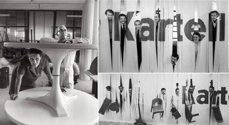 A sinistra: Anna Castelli Ferrieri e Giulio Castelli, fondatori di Kartell, fotografati in azienda nel 1967, davanti al tavolo 4993. A destra: due foto storiche dei progettisti di Kartell scattate da Ugo Mulas allo stand omonimo al IX Salone Internazionale del Mobile di Milano. Sopra, da sinistra: Olaf von Bohrn, Gino Colombini, Alberto Rosselli, Ignazio Gardella, Joe Colombo, Anna Castelli Ferrieri, Giotto Stoppino. Sotto: i designer con uno dei pezzi da loro disegnati per Kartell. Anna Castelli Ferrieri, unica donna, è ritratta con il contenitore 4970/84 in versione quadrata.