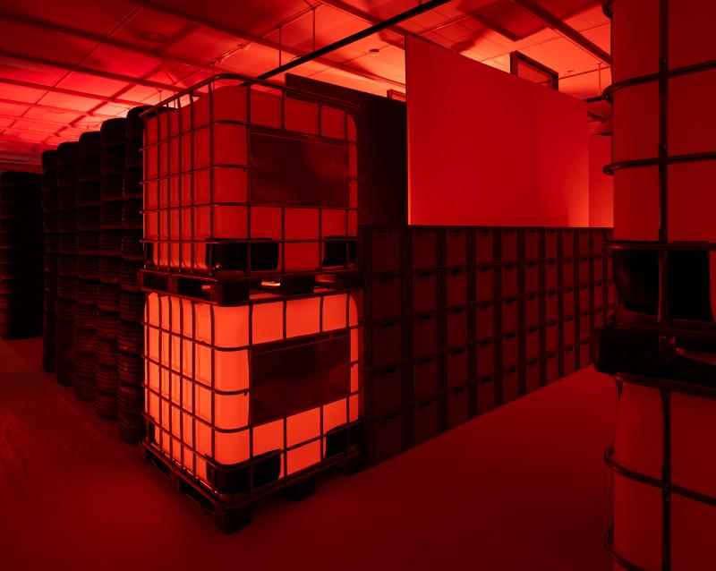 L’ambiente in cui veniamo catapultati è un sotterraneo labirintico immerso in una penombra accesa solo da bagliori rossi. Lunghi corridoi, stretti passaggi sono definiti dalla presenza, rigorosamente ordinata, di grandi quantità di materiali di origine industriale, per lo più legati al trasporto e alla logistica; ci sono lunghe file di lockers, strutture in rete metallica, colonne di copertoni, taniche, tubi, veicoli e macchinari diversi, fari che imprevedibilmente si accendono e altri oggetti. Ad essi si alternano elementi legati alla cultura underground: superfici specchianti, materassi stesi a terra che evocano i sex club, bottiglie piene di liquido rosso che fanno pensare agli energy drinks.