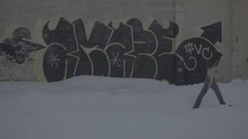 D'altra parte, in questo sottomondo in cui lo sguardo tende a perdersi tra i materiali o a rimbalzare sulle lastre specchianti, emergono alcune tracce di attività umana, nella forma di graffiti. La presenza del corpo è inoltre affidata a un avatar che compare in video: un* giovane dal genere fluido, tra l’efebico e il cristologico, che vaga, compiendo le azioni e i gesti di un’enigmatica coreografia. Lo troviamo in diversi momenti della mostra; dapprima mentre deambuliamo tra le file di lockers, immerso tra le vaste rovine imbiancate di neve intonsa di un palazzo neoclassico. Si muove lentamente, apparentemente privo di punti di riferimento e di passioni, ed esegue gesti dal significato inintelligibile. Nella sua assenza emotiva, come nel suo torace esposto, c’è qualcosa di impietosamente doloroso.