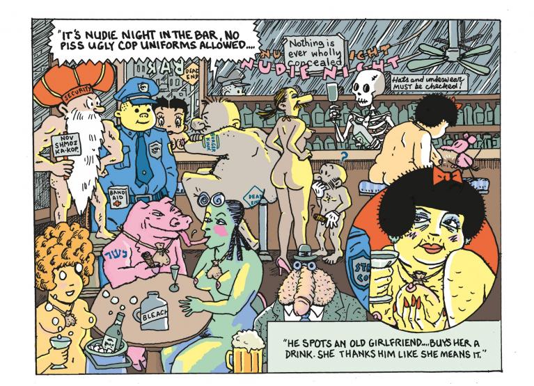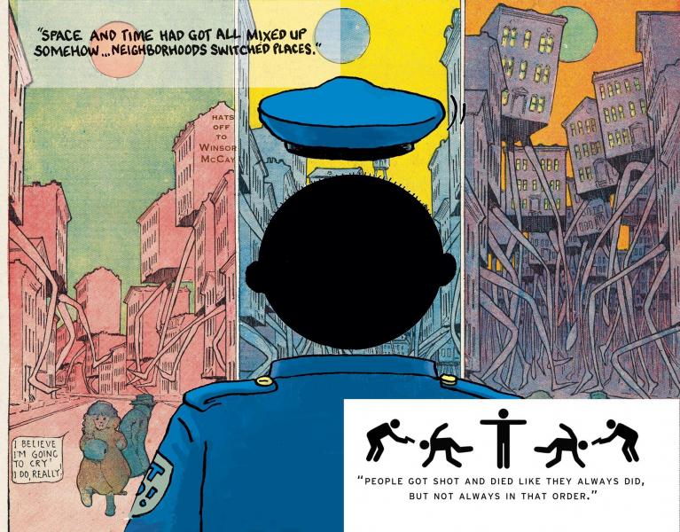 Per disegnare i quartieri che si spostano, gli edifici “mobili” della città immaginata da Coover, il riferimento non poteva essere altro che le case dalle lunghe gambe inventate da Winsor McCay in uno dei sogni di Little Nemo in Slumberland. E poi c’è un’illustrazione in particolare dove, tra gli avventori di un bar della città vecchia, spuntano Betty Boop, la già citata Nancy (ma invecchiata), il gatto Ignatz dalla striscia Krazy Kat e un personaggio di The Squirrel Cage.