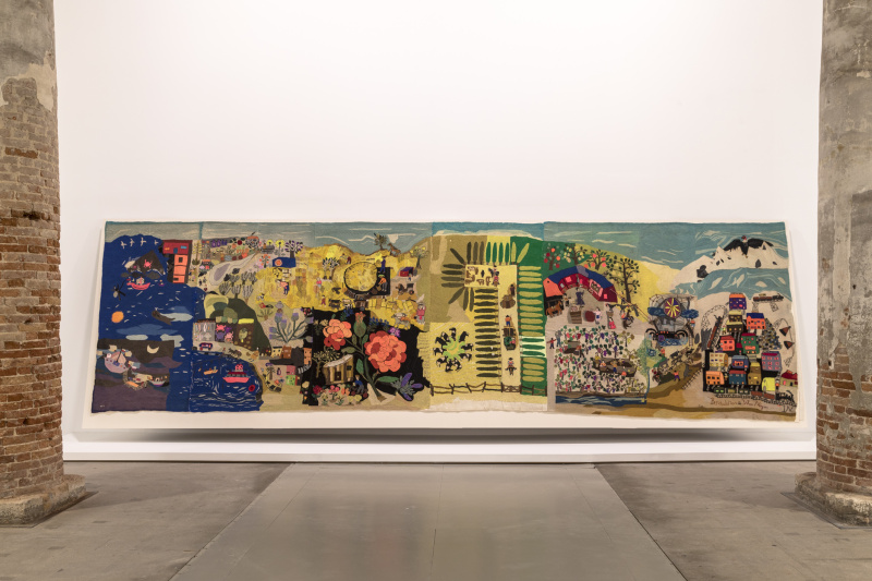 E infatti dopo il viandante di Shonibare ecco apparire una strepitosa tela ricamata, lunga quasi otto metri, risultato del lavoro collettivo delle Bordadoras de Isla Negra: un gruppo di donne cilene che fondono la rappresentazione della propria isola con quella del Cile intero, delle sue attività e dei suoi abitanti; tra gli altri personaggi qui compare la figura di Pablo Neruda. L’opera fu realizzata a grande velocità nell’ambito di un’iniziativa rimasta epica: quella di riempire di opere d'arte il Palazzo della UNCTAD III, fatto costruire a Santiago del Cile dal presidente Salvador Allende. Lo sforzo era teso a evidenziare il ruolo della cultura come strumento di lotta politica e di emancipazione.