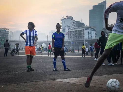 Il colpo d’occhio è semplicemente sensazionale sia per la sua geometrica armonia, sia per il simbolismo semplice dell’elemento ludico che si riappropria dello spazio, nel cuore della città, coinvolgendo persone di ogni sesso ed età. Se alcuni cerchi sono formati da amici, o comunque da persone che si danno un appuntamento, altri sono completamente improvvisati e aperti a chiunque voglia partecipare. Io vengo dalla provincia di Milano, da uno di quei paesi in cui tra cortile, oratorio e club dilettantistico il calcio era elemento di coesione supremo. Nelle città europee questa funzione di coesione del calcio si è chiaramente smarrita. Se è vero che non si può dire lo stesso per l’Africa (e in parte per il Sudamerica), è vero che nella Piazza Meskel assume una proporzione straordinaria, facendosi icona perfetta dello sport e del calcio come momento aggregativo.