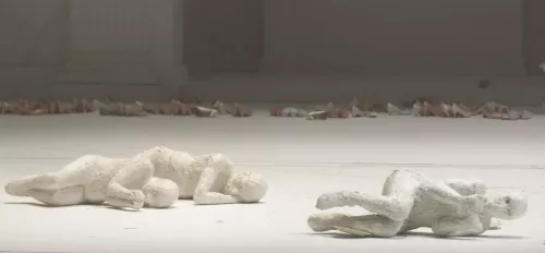 PDM: Nell’enfasi gioiosa e moralistica del finale ci viene consegnata un’immagine di immobilità e fissazione. Sono evocati i corpi bruciati all’istante dalla lava di Pompei, nell’eruzione del 79 d.C.: il fuoco improvviso coglie i corpi in movimento e li blocca per l’eternità. Cosa significa questa pietrificazione finale?