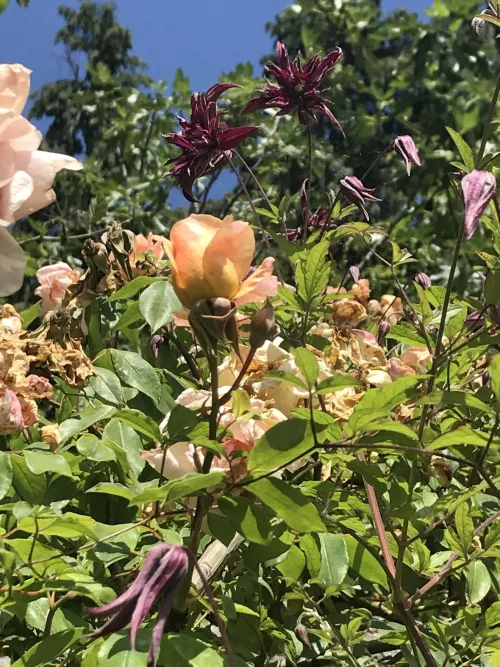 Si suol dire che le clematidi vogliano ombra al piede e sole in testa. Vero, almeno per quel che riguarda la propaggine inferiore; ma vi sono ibridi come la Comtesse de Bouchaud  dal grande fiore rosa, che vegetano sotto l’ombrello degli alberi e vi si arrampicano con piacere reciproco.