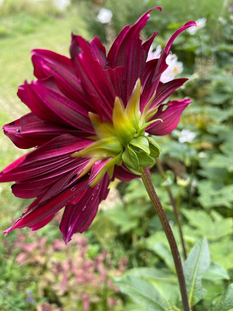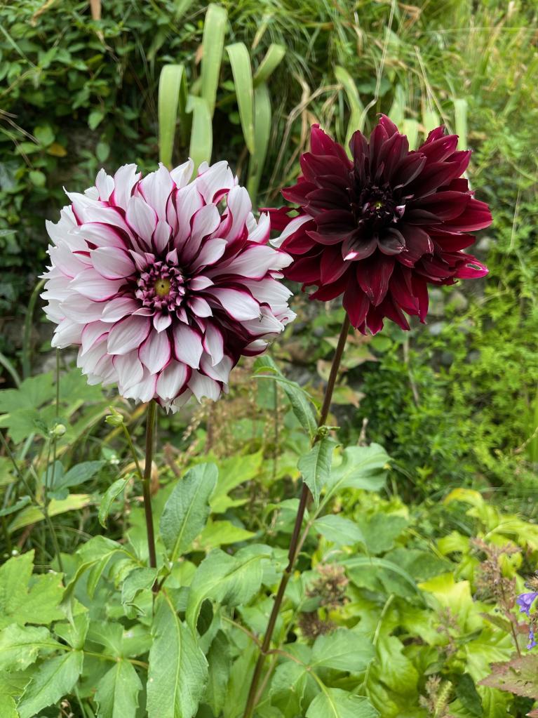 Non che tenga in modo particolare alle dalie. Con tutto quel che c’è da fare in giardino, il fastidio di dover dissotterrare i tuberi dopo la fioritura non me le rende simpatiche quanto le erbacee perenni che ad ogni stagione rispuntano puntuali. Dove l’equinozio settembrino porta il freddo, le dalie sono perenni solo sulla carta. Ogni tanto però me le concedo lasciandole alla prova dell’inverno. Preferisco quelle dalla foglia bruna con semplice corolla, specie se occhieggianti tra le salvie. Quest’anno ho provato a mescolare le più alte con gli anemoni giapponesi, sperando in una buona convivenza.