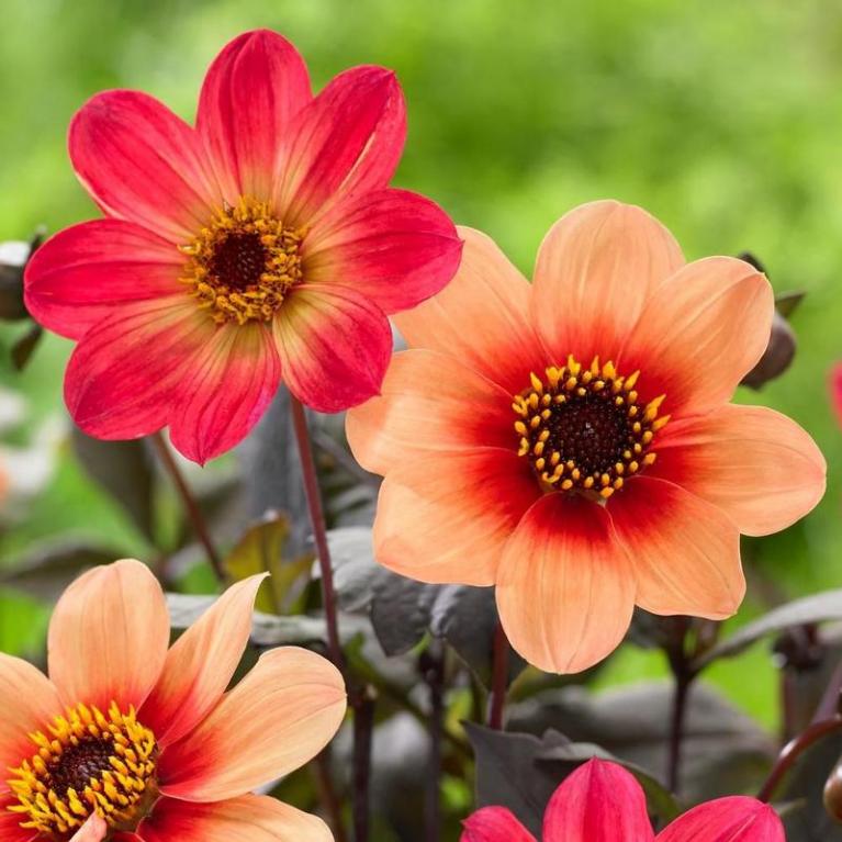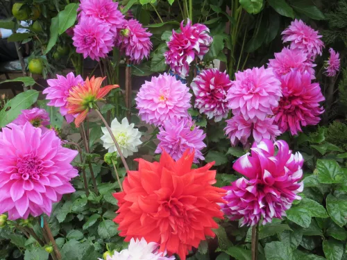 Facili all’ibridazione, sono migliaia e migliaia le varietà in commercio, esito per lo più dall’incrocio delle originarie D. coccinea e D. pinnata, entrambe a corolla semplice, e dalla D. variabilis da cui le decorative come le D. pompon – impeccabili (direbbe Verlaine) nei geometrici giri fitti di ligule – o le più grandi D. cactus dalle lunghe ligule frastagliate, curve o strette e appuntite. Sono catalogate dall’International Register of Dahlia Names in base alle fogge dei capolini e all’altezza del fusto, dai pochi centimetri delle nane ai cinque metri della D. imperialis fino ai sette della D. excelsa. Quanto ai colori, la palette è assai varia: dal bianco puro al rosso carminio fino al burgundy, passando dala delicatezza delle sfumature lavanda e dai rosa accesi, dal giallo tenero agli aranciati più solari. Per nulla dire delle striature e delle combinazioni bicolori a contrasto.