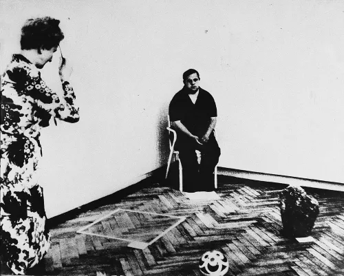 Ma c’è di più. Benché le immagini diffuse dalla stampa lo mostrino isolato, Paolo Rosa è tutt’altro che una figura messa in disparte. Siede su una sedia nell’angolo sullo sfondo e il cartellino Seconda Soluzione di Immortalità (L’universo è immobile) è poggiato ai suoi piedi. Sul pavimento di fronte a lui, sono collocati, da destra a sinistra: una pietra, una palla di gomma e il perimetro di un quadrato bianco. Si tratta di tre opere che De Dominicis aveva già mostrato alla galleria L’Attico di Fabio Sargentini, a Roma, nel 1969. La pietra: Attesa di un casuale movimento molecolare generale in una sola direzione tale da generare un movimento spontaneo della pietra (1969); la palla: Palla di gomma (caduta da due metri) nell’attimo immediatamente precedente il rimbalzo (1968); e il quadrato, un cubo invisibile la cui base è tracciata da una vernice bianca (1967).