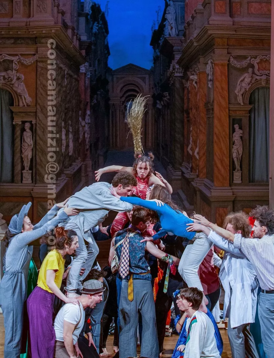 Questo è il finale della Commedia olimpica andata in scena l’8 novembre 2019 al Teatro olimpico di Vicenza, regia di Giuliano Scabia. Al centro della Commedia c’è La fine del mondo, tragedia farsa recitata dalla Fantastica Compagnia Dilettantistico Amatoriale che racconta l’estinzione dei dinosauri. Prima dell’epilogo è sorto il Leviatano che insieme a Fiore lo spazzino indù pulisce il mondo da deiezioni, immondizie e virus.