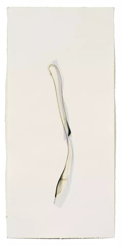 Non più in una camera oscura, con vaschette e liquidi rivelatori e fissaggio dell’immagine latente su carta sensibile, ugualmente ha “sviluppato” dei segni. Anziché carta sensibile, si è servita di fogli di carta Arches da acquerello cotone 100% da 365 gr da lei stessa ritagliati a mano; al posto delle vaschette, ha impiegato una vasca e, invece dei liquidi rilevatori e fissaggio, ha usato taniche e taniche di acqua distillata per catturare le immagini-segno. Facendo propria una tecnica variamente adottata da John Reuter, Sergio Tornaghi, Peggy Hartzel e Anna Tomczak, Beatrice Pediconi, anche in questo caso, ha dato una personale interpretazione al procedimento dell’emulsion lift. Sostanzialmente consiste nel distacco dell’emulsione esclusivamente delle fotografie istantanee, attraverso la quale si separano gli strati della pellicola autosviluppante, per riposizionarli su un cartoncino e ottenere così degli effetti artistici. Ma, anziché mettere in atto una trasposizione tal quale dell’immagine prelevata, Beatrice Pediconi, interessata ai momenti di transizione, al passaggio da uno stato a un altro, con la stessa gestualità dello sviluppo manuale delle fotografie, riduce lo strato dell’emulsione a una linea. E mediante movimenti flessuosi e ondulatori, variamente la dispone sul foglio di carta.