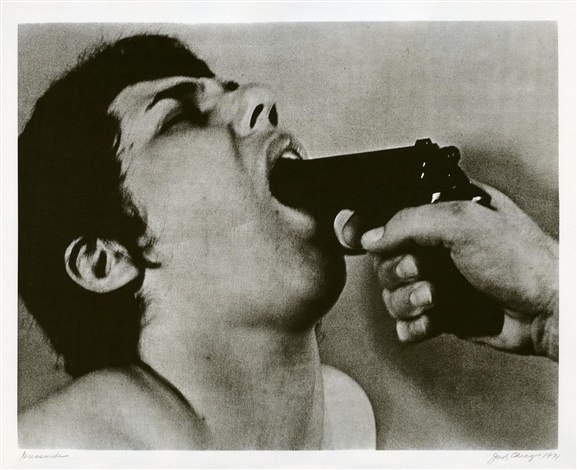Shoot. Il 19 novembre 1971 Burden – allora studente venticinquenne all’Università di California a Irvine – è alla Santa Ana Gallery, vestito in jeans e maglietta bianca, l’uniforme di Jackson Pollock nel suo atelier. Qui sfidò e sfuggì alla morte con una sorta di suicidio assistito: alle 19:45 chiede a un amico di sparargli sul braccio sinistro (sulle prime pensava alla cassa toracica) con un fucile calibro 22, a soli quattro metri e mezzo di distanza. Fu “come se un camion mi colpisse il braccio a 130 km/h”, ricordò, “In quel momento ero una scultura”; un incidente, dirà invece al pronto soccorso. Lo stesso anno Judy Chicago – che nel 1970 inaugura alla California State University a Fresno il Feminist Art Program – realizza una litografia in cui si mostra costretta a una fellatio con la canna di una pistola (Gunsmoke, 1971). È il passaggio dai dipinti astratti con riferimenti a “falli, vagine, testicoli, uteri, cuori, ovaie e altre parti corporali”, trucco e mestruazione, alle sue azioni femministe più radicali.
