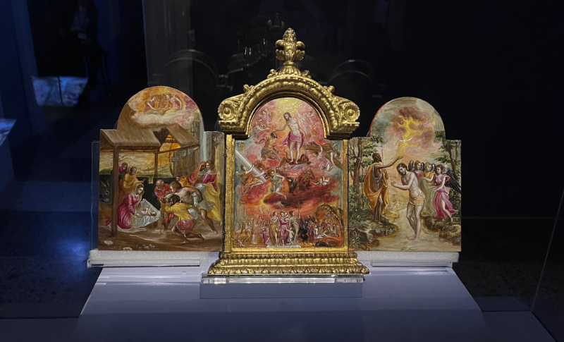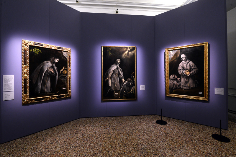 La mostra documenta sia il periodo cretese che i due veneziani e quello romano, con opere già di alta qualità raramente esposte insieme, anche se il suo piatto forte sono quelle, spesso ubicate in sedi non facili da raggiungere, dipinte in Spagna, quasi tutte a Toledo dove il pittore, divenuto nel frattempo El Greco, resterà fino alla morte nel 1616. È a Toledo che avverrà il grande cambiamento che porterà alla definizione di uno stile che lo renderà inconfondibile, grazie alle commissioni di importanti retablos che gli consentiranno di esprimersi, sia pure tra qualche periodico contrasto come per il famosissimo Espolio, in opere di grande formato e ambizione con una crescente libertà di invenzione che non era stata invece compresa a Madrid, dove si era recato nei primi tempi sperando di poter partecipare alla decorazione dell’Escorial allora in costruzione. A Toledo invece, città imperiale fino al 1560 ma ancora vivace intellettualmente ed economicamente e meno condizionata dalle regole e dai gusti della corte, grazie anche al sostegno di influenti protezioni e amicizie, la sua creatività non ebbe in un certo senso altri freni che quelli che si imponeva lui stesso, pur nella sincera consonanza di dottrina e di sentimento religioso con le scelte ufficiali in materia di fede e di arte della Controriforma oltre che con i gusti dei suoi committenti, usando “magistralmente le formule emozionali per metterle al servizio della fede” (id.).