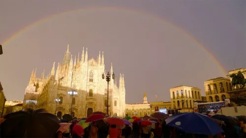 L'impietoso controcanto è stato dato, la sera dopo, dagli arcobaleni su Piazza Duomo durante il concerto per il centrosinistra, fotografati ed uploadati in tempo reale su Facebook da migliaia di manifestanti bagnati e festanti.