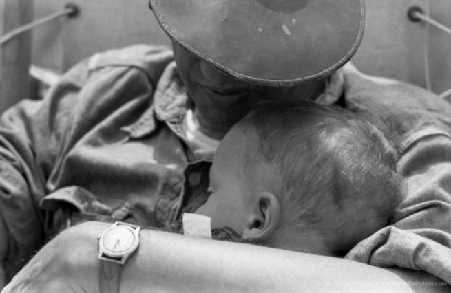 Da sinistra: Sid Grossman e il figlio Adam sul trattore; Sid Grossman stringe tra le braccia il figlio Adam, Provincetown, 1955, ph. Harold Feinstein