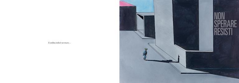 Una bellissima intuizione da cui prende le mosse Non stop è l’immagine di un uomo che si lascia guidare per le strade deserte della città dalla sua ombra, e in questo modo riesce a scampare una serie di pericoli imprevedibili. Nella letteratura per l’infanzia l’Ombra è anzitutto l’Altro, spesso interpretato in termini negativi come il Nemico, lo spauracchio, l’uomo nero o la strega malvagia. È la manifestazione oscura dell’imago materna e paterna nei loro connotati più spaventosi, annidata nell’inconscio del bambino, ma è anche il riflesso perturbante di un doppio, la rappresentazione di una parte di sé che il bambino non conosce, che censura o della quale ha paura. Nelle opere che attingono più a fondo dai pozzi dell’immaginario infantile, come ad esempio nella scena in cui la perdita dell’ombra di Peter Pan prelude all’incontro con Wendy, l’Ombra è una figura della soglia e dell’ambiguità, immagine al contempo dell’Altro e del Sé, capace di svelare dietro l’opposizione una trama di relazioni.