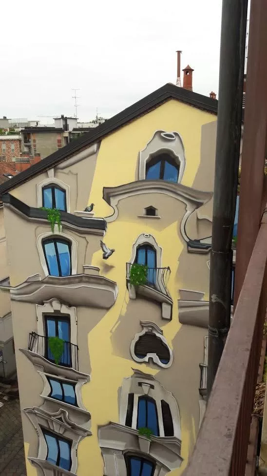 Rispetto a questa serie, dove i volumi e le forme si agitano e sembrano vivere di vita propria, a queste architetture da Cartoonia, il trompe-l’oeil milanese rappresenta una sorta di stato intermedio bidimensionale, quasi un ironico contro-progetto che non fa altro che esasperare coerentemente un anticipo o un implicito invito già visibile nella facciata tridimensionale dietro l’angolo.