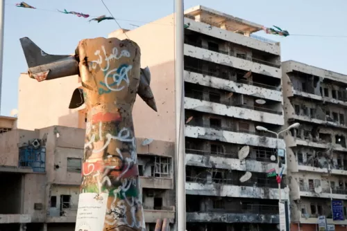 Nel caso della Libia quello che ho cercato di tracciare è un ritratto delle architetture del regime - il regime di Gheddafi - distrutte dalla recente rivoluzione. Sono partita da ovest, da Benghazi, città da sempre ‘nemica’ al colonnello, dove è iniziata la rivoluzione, per poi arrivare a Tripoli, dentro alla caserma-bunker di Gheddafi, dentro alla sua casa. Ho cercato anche di creare un parallelismo con le immagini d’archivio da me collezionate negli anni, che ritraggono un Gheddafi giovane e sorridente, un Gheddafi circondato da quei politici con cui per anni ha fatto affari e che poi gli hanno voltato le spalle, fino ad arrivare alle immagini della sua morte, sanguinante e ridotto a pezzi come le architetture che lo rappresentavano.