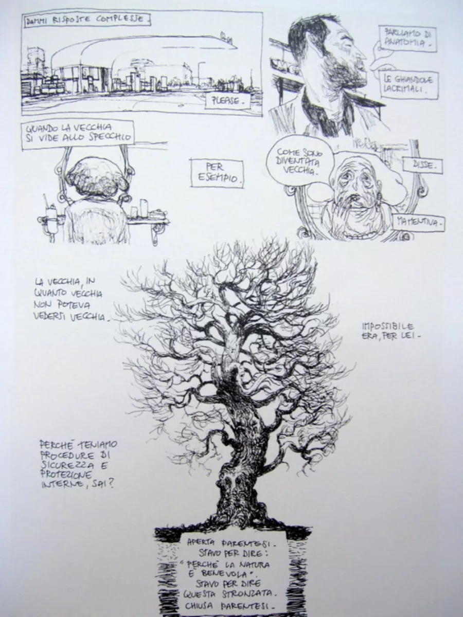 La storia degli alberi che costellano tutto li libro: l’albero solo e imponente che si allarga in copertina, gli alberi martoriati del fronte, quelli secchi che disegna ossessivamente Silvano, l’albero caro e rigoglioso della casa di Mauro. Gli alberi longevi che vedono le cose cambiare e invecchiare, rimanere uguali e fermarsi fino a distruggersi.