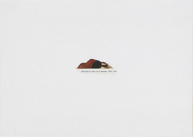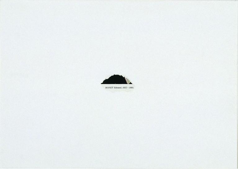 Due anni dopo, un’analoga sineddoche trova sviluppo attraverso frammenti lacerati da un volume in francese, recanti il nome e il cognome di un artista di volta in volta diverso, scritti con caratteri tipografici. Si tratta di tre opere del 1969, il cui comune denominatore è l’applicazione al centro di un foglio bianco da disegno del frammento lacerato di una riproduzione fotografica a colori, che presenta il dettaglio di un quadro e parte della relativa didascalia: “ROUSSEAU Henri, dit le Douanier, 1844-1910”, “MANET Edouard, 1832-1883”, “LEGER Fernand, 1881-1955”.