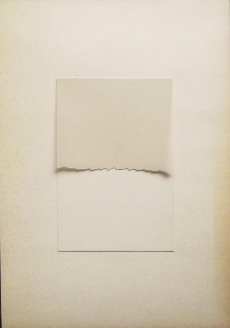 L’artista lacera un foglio di carta bianca lungo il margine inferiore e lo applica, in corrispondenza dei suoi due angoli superiori, su un più ampio ma analogo foglio che funge da supporto. La superficie originaria è dunque trattata in due modi diversi, mediante gesti tra loro antitetici: “Se c’è un bordo regolare e rettilineo, può esserci, al di sotto, un’incollatura fissativa; se invece c’è uno strappo, non posso fermare con la colla il margine strappato perché lo strappo interrompe, non fissa.” Paolini è dunque presente e al contempo assente: da un lato, l’astensione dall’azione (il lasciare cioè il margine superiore del foglio rifilato come in origine) è seguita da un intervento che, seppur limitato a due punti di colla, fissa il foglio al supporto, conferendogli duchampianamente lo statuto di opera d’arte; dall’altro, il gesto “invasivo” della lacerazione, è seguito da un venir meno della presenza di chi lo compie, che lascia il margine lacerato completamente libero dal supporto. Essendo applicata solo in corrispondenza dei due angoli superiori, la superficie risulta in parte mobile: sottende la possibilità di essere alzata e abbassata come un sipario su un palcoscenico. L’artista interviene inoltre sul foglio delineando un tratto a matita centinato, che non riesce però a circoscrivere del tutto lo spazio di cui vorrebbe costituire un limite. Assume così una valenza operativa e “simbolica”, in quanto evoca l’idea di misura alla stregua del gesto della lacerazione. Se quest’ultimo “è un constatare la lunghezza del foglio, il tratto a matita è constatarne la finibilità, cioè l’esistenza di un bordo”. A due modi di misurare corrispondono altrettante eventualità di mostrarsi della carta: quanto il foglio di supporto è liscio, ortogonale e ben stirato, quanto il foglio ivi applicato è stropicciato, convesso e vissuto. Ancora una volta siamo di fronte alla polarità di azione/non azione. La linea incurvata del disegno, inoltre, richiamando quella altrettanto irregolare della lacerazione, ribadisce la contrapposizione tra i due margini superiore (diritto) e inferiore (non rettilineo). Vicino alla ricerca tesa all’azzeramento della superficie pittorica avviata da Piero Manzoni e dal gruppo Azimuth, il bianco su bianco di Paolini assume quali soggetti principali gli elementi cartacei che lo costituiscono, indagandone i limiti materiali e le potenzialità percettive. Parimenti a quanto effettuato nel suo primo quadro intitolato Disegno geometrico (1960), Paolini nel suo primo collage cerca di delimitare lo spazio della rappresentazione per qualificarlo come neutro e universale. Per farlo, abbandona l’aulica e oggettiva squadratura geometrica a inchiostro di quella tela, in favore di un tratto libero a matita che, pur non toccando il margine destro del supporto cartaceo, segnala l’esistenza di uno schermo capace di lasciare ancora una qualche libertà/soggettività all’autore ponendosi tra casualità, oggettività e assoluto.