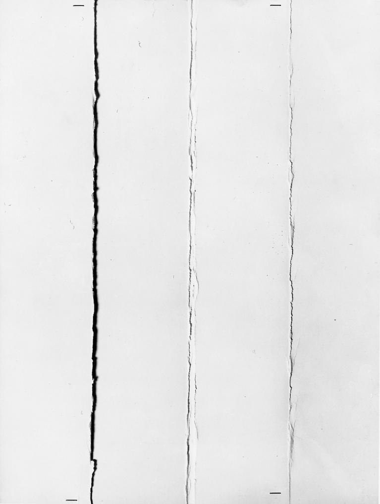Un foglio di carta bianca, strappato in corrispondenza dei due bordi laterali, piegato in otto parti e poi ridisteso, si presenta leggermente lacerato anche lungo le piegature. I margini laterali del foglio vengono ripiegati verso il suo interno e trattenuti in quella posizione mediante quattro punti metallici (uno in alto e uno in basso per ognuno dei due margini). “Le piegature lacerate e i margini strappati non permettono di capire se si tratti di uno o più fogli ripiegati, confondendosi le une negli altri. L’opera rinvia all’idea di come un foglio possa nascondere le peripezie alle quali è stato senza senso sottoposto.” Il nonsense duchampiano che sembra informarla, in verità, è solo apparente: la lacerazione è volta a rendere percepibile lo spessore della carta e ad attivarne la superficie (o la pelle) come se fosse un corpo autonomo ma inerte che l’artista ha solo il dovere di rianimare. L’attivazione della superficie mediante segni regolari (le piegature verticali) richiama, non a caso, le superfici estroflesse di Castellani e Bonalumi, ma anche le ricerche cinetico-programmate che proprio in quell’anno venivano presentate alla mostra, visitata dallo stesso Paolini, tenutasi presso il negozio Olivetti di Milano. Il gesto del ripiegare un foglio di carta anticipa inoltre l’idea di disegno (cfr. cap. III), formulata in seguito dall’artista, come superficie contenitrice che cela qualcosa allo sguardo e al contempo come schermo atto ad accogliere un gesto.