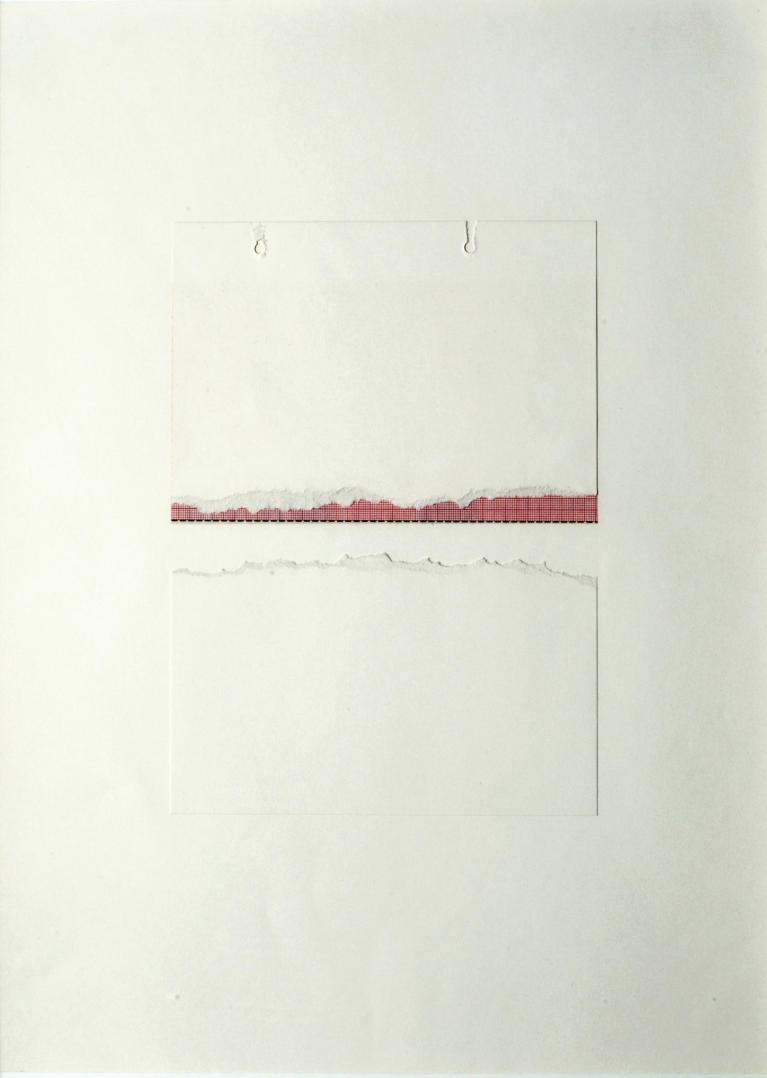 L’intento è evocare/ricomporre la doppia pagina del quaderno a quadretti da cui sono stati tratti i due fogli applicati a breve distanza l’uno dall’altro al centro del supporto. Alla “decostruzione” del quaderno segue la sua “ricostruzione”, ma alquanto potenziata, giacché la lacerazione dal margine interno delle due pagine e l’intervallo lasciato tra queste, mettono in tensione le due parti. Anziché attraverso il ritaglio e la giustapposizione, l’immagine del quaderno originario si ricostituisce davanti ai nostri occhi con maggior evidenza mediante la lacerazione stessa dei due fogli, posta in risalto dallo spazio che li divide. Come nell’opera precedente, i margini interni strappati si contrappongono a quelli esterni rifilati e al tracciato a inchiostro nero ivi delineato: “La ferita dello strappo è medicata attraverso un filetto che, pur essendo interrotto in corrispondenza dell’interruzione tra i due fogli, incornicia e trattiene le due parti, fungendo da limite (o presa di coscienza) della superficie del foglio.” Sebbene attui un taglio/ferita apparentemente analogo a quello inferto alle tele da Fontana e ai sacchi da Burri, Paolini “cancella” la pulsione che potrebbe sembrare averlo dettato attraverso materie e azioni del tutto impersonali: le due pagine strappate sono prestampate, geometriche e regolari (in quanto quadrettate), e vengono ricollocate/rilegate a doppia pagina dal filetto nero. Il collage indaga quindi il modo corretto con cui dovrebbero manifestarsi gli elementi che costituiscono un’opera: non dovrebbero nascondere il supporto, ma lasciarlo sempre intravedere.