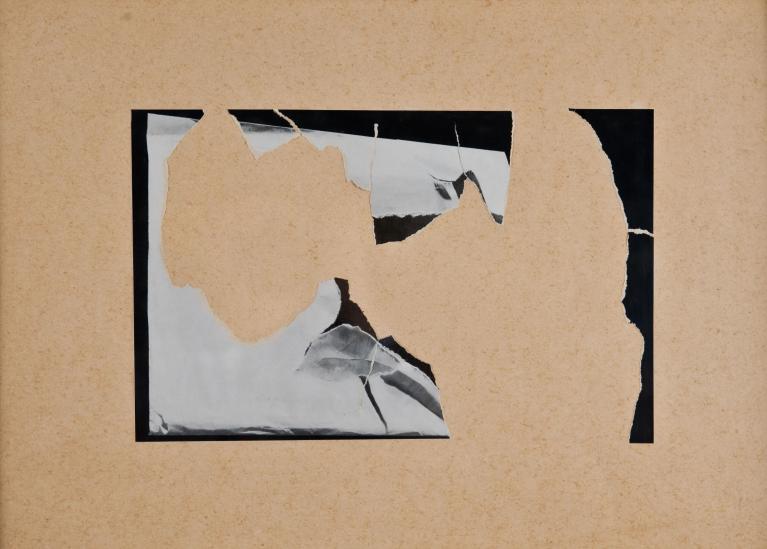 Nel Senza titolo (1969), al centro del cartoncino di supporto (a oggi ingiallito), sono applicati i tre frammenti di una fotografia lacerata che riproduce su fondo nero una busta bianca vista di sbieco, probabilmente tratta da una rivista dell’epoca, attualmente non identificabile. I tre reperti sono disposti in modo da rispettare i margini, la forma e la misura della fotografia originaria: inquadrano un’immagine resa irriconoscibile e lo spazio necessario alla sua ipotetica (s)comparsa, ma evocano al contempo il profilo della riproduzione di partenza tentandone una parziale ricomposizione.