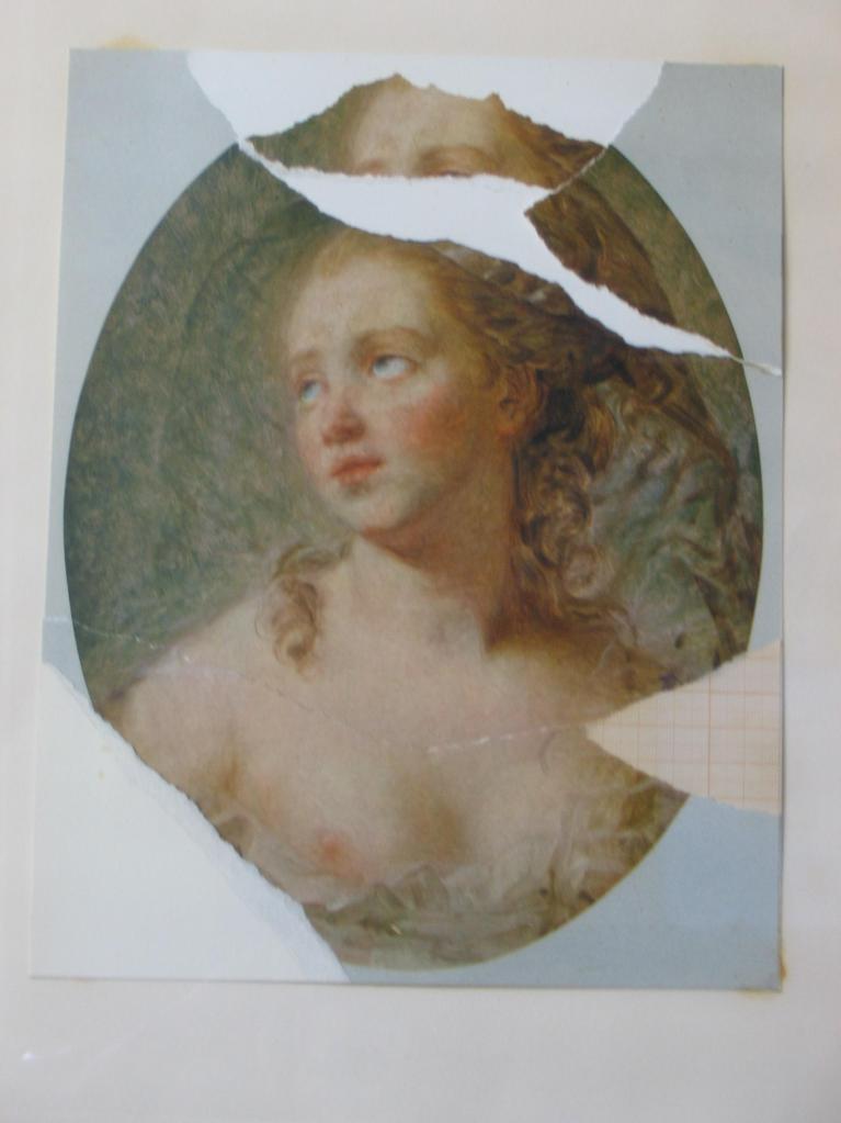 Lo stesso succede in un Senza titolo del 1975, ma in questo caso con un soggetto di ambito storico-artistico. Dall’immagine di una figura femminile, tratta probabilmente da un dipinto di Fragonard e applicata su un foglio bianco, Paolini sottrae gli angoli inferiore sinistro e superiore destro, nonché l’intera metà inferiore. Cerca in seguito di ricomporre il perimetro ovale entro cui la figura si mostrava attraverso due frammenti: l’uno corrisponde a una parte del medesimo angolo superiore lacerato, l’altro a un dettaglio di una seconda copia dell’immagine originaria. Tenta inoltre di ridare unità all’intera figura, giustapponendo alla sua metà superiore parte di quella inferiore mancante e un triangolo di carta millimetrata lungo il margine sinistro. “La riproduzione subisce una lacerazione, per poi ricomporsi e proporsi, anziché come copia di qualcosa di esistente (il quadro), come immagine nata hic et nunc.”