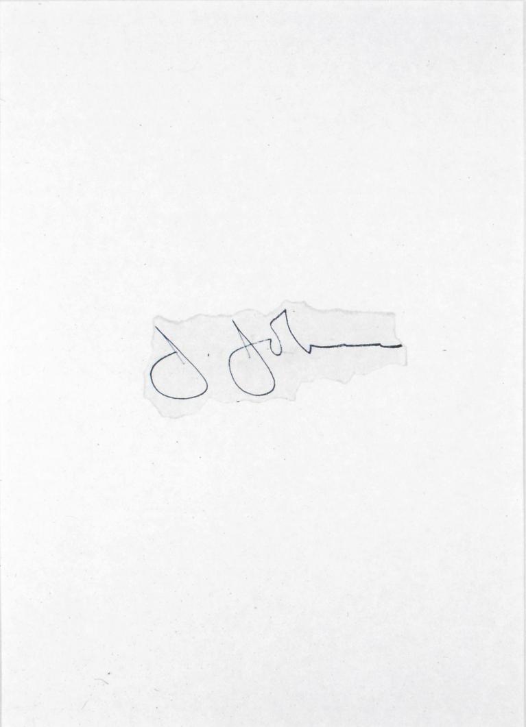 Nel Senza titolo del 1966 l’artista si identifica con Jasper Johns, applicando la riproduzione fotografica lacerata della sua firma in posizione centrale su un foglio di carta bianca. Ad accomunarlo all’artista americano è l’indagine attorno alla pittura come linguaggio e agli strumenti a essa impliciti o preliminari.