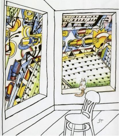 Finito il disegno Steinberg non smette di giocare e incolla sul davanzale della finestra di destra un rettangolino di carta su cui ha disegnato un gatto. L’animale più caratterialmente disinteressato alle nostre congetture. È lui l’osservatore.