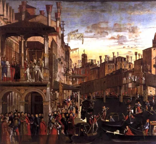 Ho letto questo finale, per caso, seduto davanti al Miracolo della reliquia della croce al ponte di Rialto di Vittore Carpaccio all’Accademia. Guardavo la pagina e alzavo l’occhio. Anche là c’è una città che si mostra come in una scena teatrale a chi guarda. Ma in posa sono anche i gondolieri, tutti, sui vari piani. Anche il ponte di legno e i camini caratteristici. Tutte le figure umane si offrono, si esibiscono allo spettatore, foresto o cittadino, immagine di città, di comunità. Nel racconto di James c’è un occhio nuovo. Sulla gondola c’è il voyeur. Il protagonista del tour-ismo, lo straniero raffinato, che ormai, come oggi le masse di giapponesi e cinesi, è quello che principalmente prende le gondole. C’è un’idea di città snaturata, che mentre continuamente si vende tiene chiusi, stretti a sé i propri segreti, i propri rituali. Come Juliette.