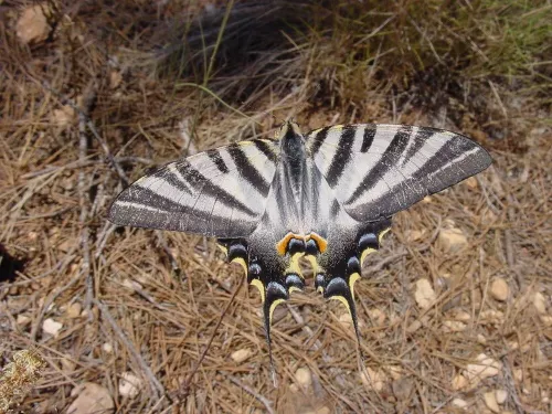 Pochi anni dopo, ne vedetti molti di podalirio nelle radure xeriche e fiorite che attorniavano la vecchia ferrovia del paese in cui ero andato a vivere con la mia famiglia. Lì, in quelle radure che mi ricordavano la savana, trovai anche la sua pianta nutrice, il prugnolo, e cercai i bruchi del podalirio sulle sue foglie. Ne trovai: erano verdi e con il capo massiccio, con alcune sbiadite strie longitudinali chiare; li allevai per la prima volta riuscendo a seguirne la metamorfosi a crisalide brunastra e poi a splendida imago che mi nacque in tarda estate con grandissima soddisfazione giovanile. Il podalirio è in realtà una farfalla diffusa che si osserva un po’ ovunque e si riconosce facilmente grazie all’aspetto unico tra le specie europee. Negli ultimi anni, quella che si pensava ne fosse una sottospecie tipica della penisola iberica, Iphiclides feishtamelii, è stata riclassificata dagli esperti come bona specie, ovvero come specie a se stante. Vidi anche questa anni dopo, intento a rubacchiare mandorle mature nelle campagne del Penedes in Catalogna, mentre stava delicatamente veleggiando sotto ai mandorli carichi di frutti. Più bianca del podalirio e con le strie nere forse più contrastate, le assomiglia da vicino e può confondere chiunque, se non fosse che, dove c’è il podalirio, il feishtameli non c’è e dove c’è il feishtameli il podalirio non vive. La cosa è strana: infatti che si tratti di due specie distinte non è poi così sicuro e non mi stupirei se, un giorno, studi genetici approfonditi ci diranno che le due farfalle sono più imparentate di quel che paiono ora.