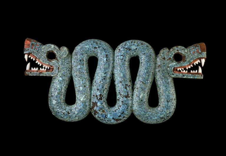 Serpente a due teste, XV-XVI sec., mosaico in pietra turchese e conchiglia su base lignea, British Museum, London.