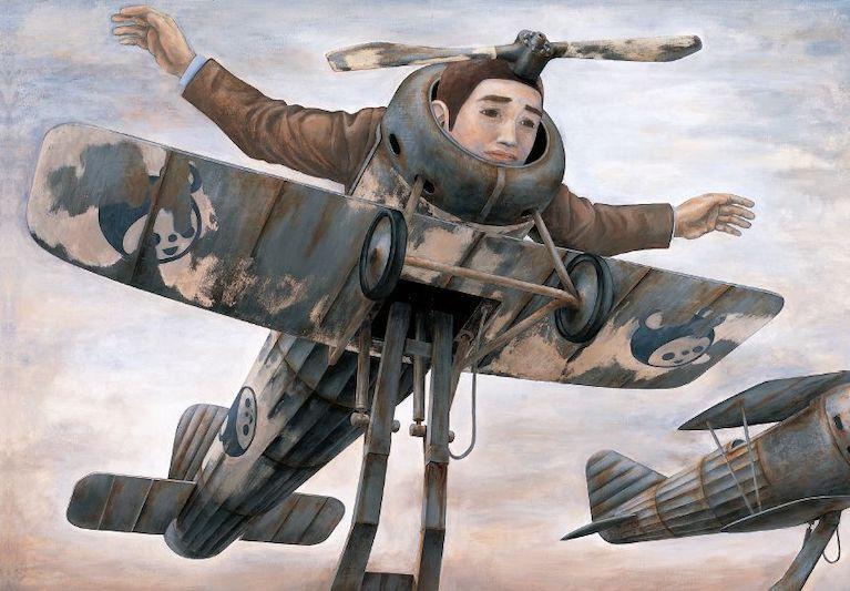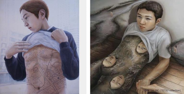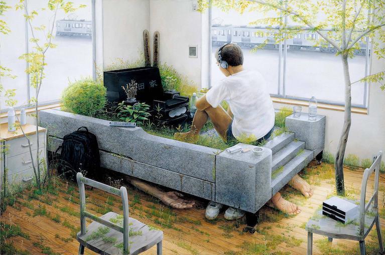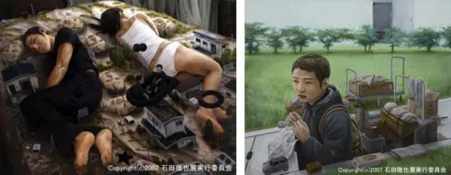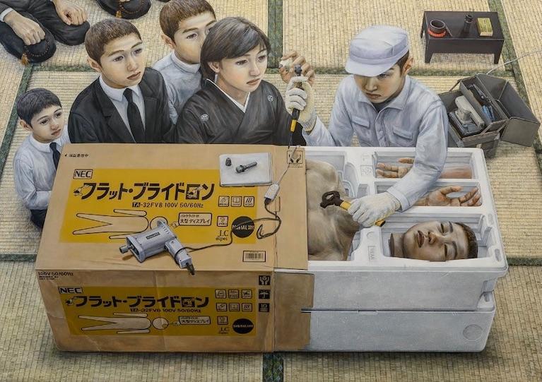 Il tema della metamorfosi inquietante, di primaria importanza sia nella narrativa di Kōbō Abe che nei dipinti di Tetsuya Ishida, si sviluppa in entrambi i casi a partire da una riflessione sulle alienanti condizioni di vita contemporanee. L’uomo-macchina che compare in molti dipinti di Ishida è l’individuo isolato come milioni di altri suoi simili all’interno di città sempre più grandi e spersonalizzanti, o il comune impiegato oppresso dalla burocrazia e dall’inarrestabile processo di automazione del lavoro, ed è soggetto a una reificazione più o meno invasiva che l’ha tramutato in uno strano ibrido meccanico dotato di un volto. È quasi sempre immobile e costretto in spazi angusti come un prigioniero, e nelle rare situazioni che implicano un tentativo di fuga la sua impotenza emerge con accenti addirittura patetici, come quando in un dipinto lo vediamo correre sul rullo di una catena di montaggio, o in un altro, dal titolo Can’t Fly Anymore (1996), mentre mima il volo all’interno di un modellino di aereo che ha tutta l’aria di essere l’attrazione di un vecchio e anacronistico parco a tema.