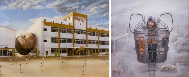 L’uomo dai capelli corti dei dipinti di Ishida ha uno sguardo perso nel vuoto che a un esame più accurato, spesso, somiglia allo sguardo di una persona in attesa di qualcosa. Anche se i suoi occhi non sono rivolti in modo diretto allo spettatore, l’impressione è che l’uomo si predisponga a essere osservato, in una sorta di appello silenzioso che può far pensare a una richiesta di aiuto. In alcuni dipinti la dinamica di questa osservazione reciproca è tradotta in figura, con l’uomo che guarda e che diviene oggetto dell’altrui sguardo. In Prisoner (1999) è un gigante che osserva i bambini nel cortile di una scuola, e per il quale l’edificio in cui è intrappolato – come in altri dipinti un numero incalcolabile di oggetti e animali – sembrerebbe una specie di guscio protettivo. In Rescue (2003) una donna accompagnata da un bambino tende le mani verso una persona non mostrata, che si suppone essere l’uomo dai capelli corti o una sua incarnazione infantile: il punto di vista di quest’ultima, per via dell’ennesimo capovolgimento, coincide con quello dello spettatore.