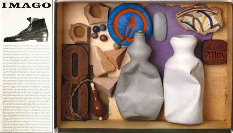 Michele Provinciali, Presentazione della rivista Imago, pieghevole a due ante, testi di Michele Provinciali e Aldo Borlenghi, 1960. Scatola con gli oggetti in attesa di progetto, 1986.