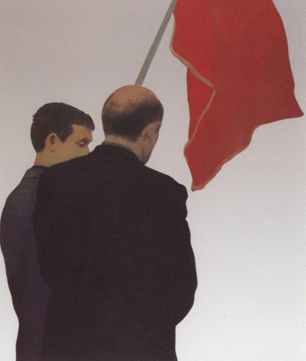 Gli uomini di spalle, le bandiere ripiegate, un momento di attesa che non passa. Riflesso nella superficie specchiante del quadro l’osservatore vive un presente permanente che si rinnova nell’istante. Un eterno presente: condizione d’un paese in stallo, dimentico del suo passato e ignaro del suo futuro.