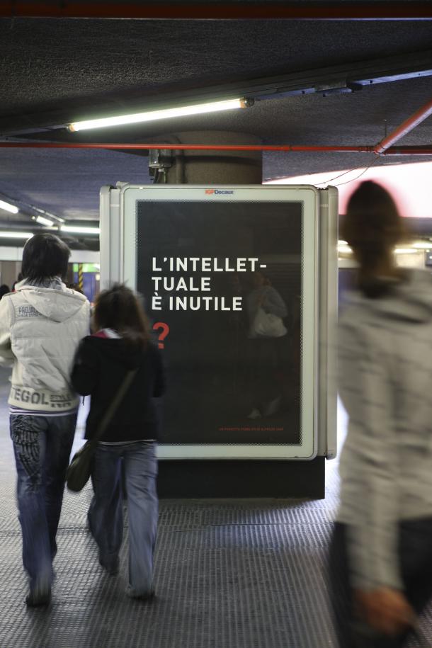Grandi manifesti 6x3, fiancate di autobus, locandine e cartoline su cui erano stampate, in rosso o bianco su fondo nero, una serie di domande destinate ad interrogare la necessità, il ruolo e la funzione della cultura nella nostra società: l’intellettuale è inutile? La politica ha bisogno della cultura? La cultura è critica sociale? La cultura è necessaria?.....