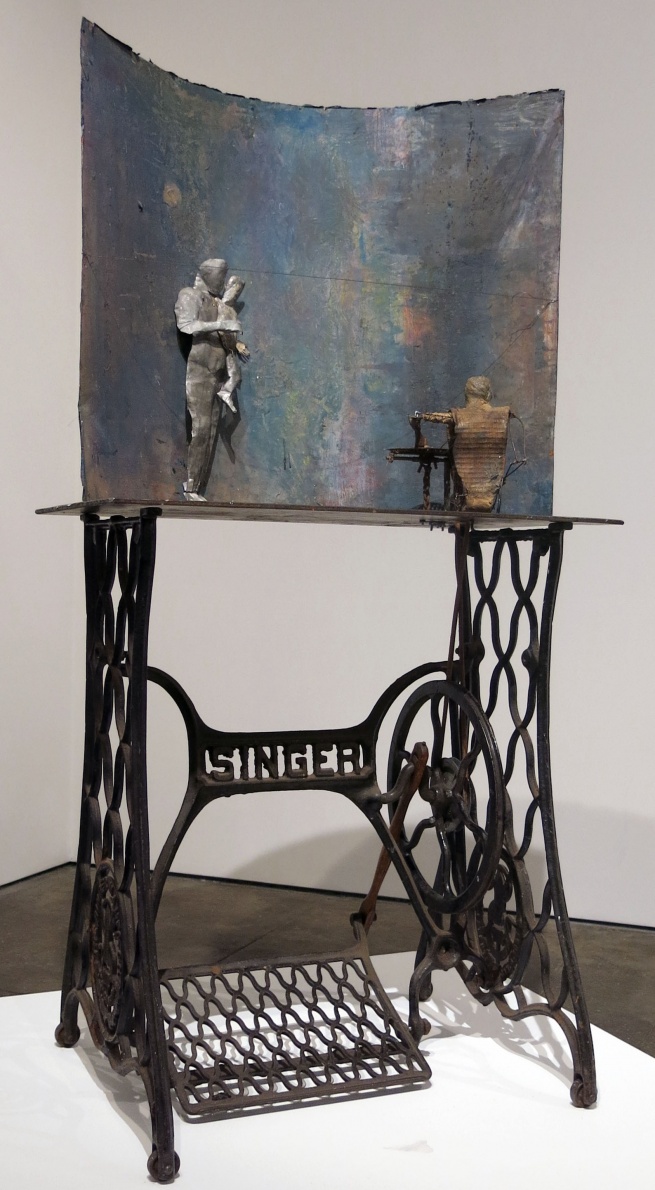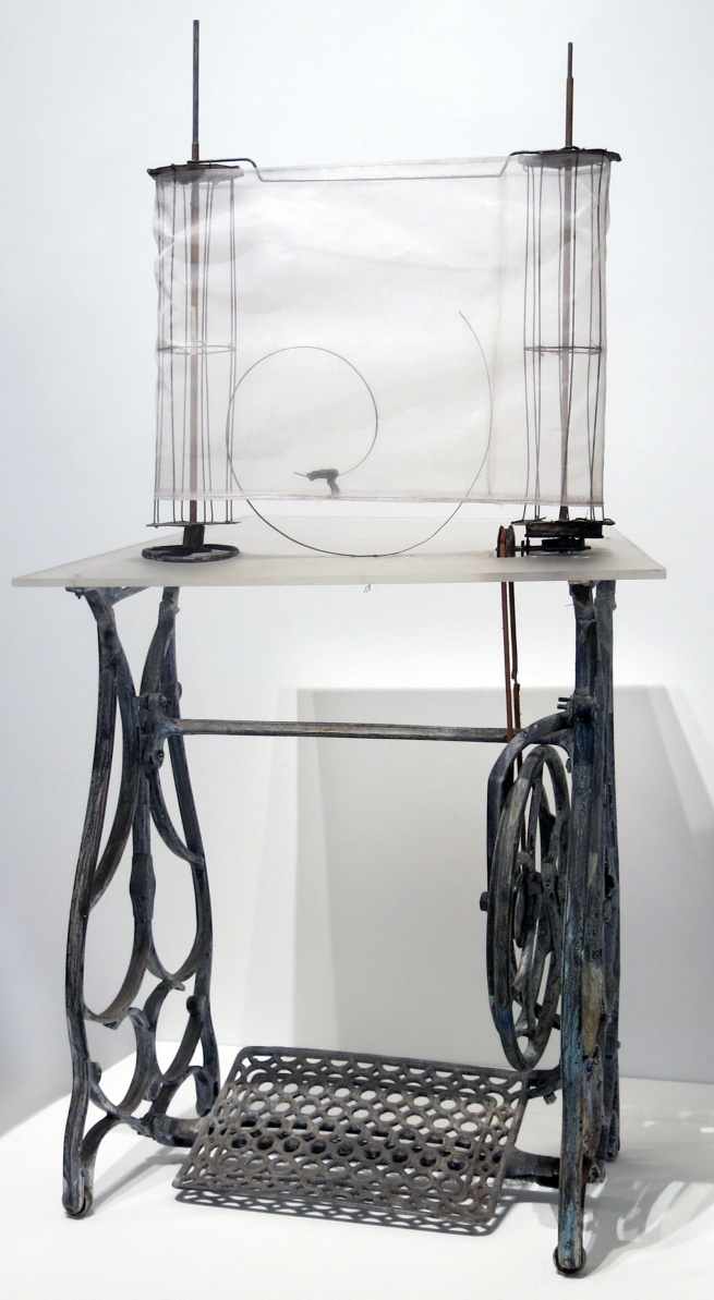 Non a caso l’artista si serve di ‘basi’ o ‘strutture’ strappate alla loro funzione originaria e convertite in piedistalli nient’affatto muti o neutri. Come nei Canti di Maldoror di Lautréamont, trasformato in basamento, il tavolo della macchina da cucire sembra cedere a un’azione che trascende la sua disattivata promessa cinetica. E i rulli/pilastro muovono e insieme sigillano nel tempo sospeso del mito.