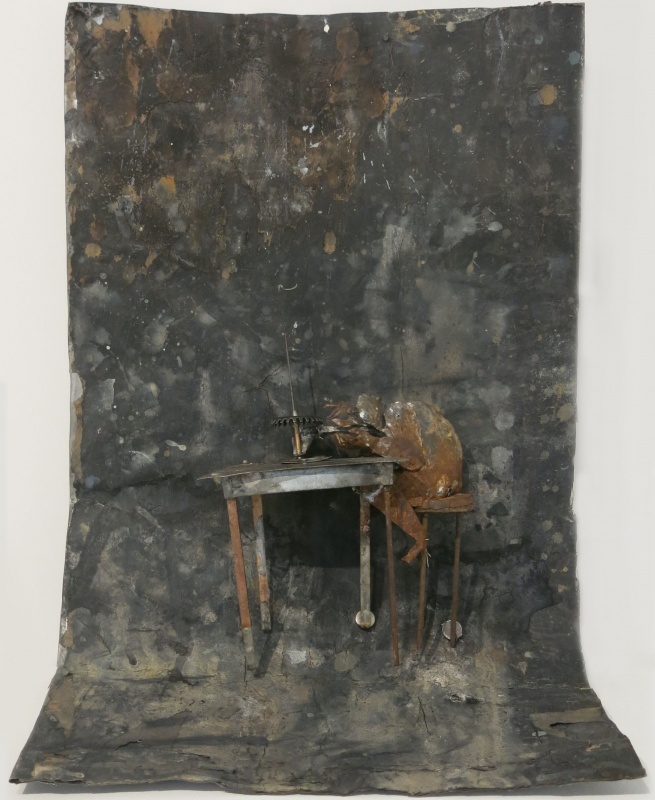 Che il fondale e le figure si sviluppino nello spazio tridimensionale attraverso l’assemblaggio di materiali diversi o che la loro volumetria sia compressa nella bidimensionalità di un foglio di carta o di una tela tormentati dal colore, il tropismo è sempre lo stesso: la creatura viene pensata, immaginata, voluta e infine creata da un soggetto che si rivela proprio attraverso l’atto creativo. Uno scambio alla pari, un duplice incantamento che l’osservatore è invitato a guardare, riflettendovisi come nelle trasparenze oscure di un lago.
