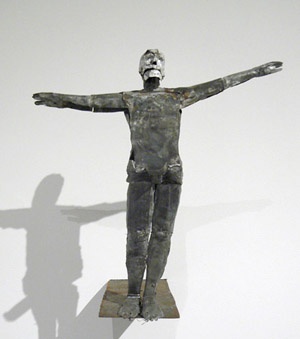 Malleabile e argenteo, resistente alla corrosione, lo stagno – materiale d’elezione dell’artista – è un metallo sonoro: piegato stride, riscaldato si spezza. Leaf lo plasma per ricavarne morbide figure che portano in sé tutta la vulnerabilità della carne, la sua silenziosa richiesta, la sua labile offerta. Incastonate in fondali materici e fuligginosi oppure in bilico su un ciglio come se stessero per precipitare, arrugginite da una misteriosa implicita usura, le sue figure si annunciano come piccoli teoremi privati per poi rivelare d’un tratto quello che davvero sono: fulgide rappresentazioni del mondo in cui viviamo e della nostra inspiegabile resa. Come non riconoscere, dietro l’“Uomo come scolatoio” del 2007, apparente ironica rappresentazione della virilità e delle sue aporie, il riferimento dolente alle tecniche persuasive messe in atto dagli americani a Abu Ghraib? O, dietro le sue leggiadre danze macabre, un insistente memento mori lanciato nel vuoto di un presente che si dice senza Storia.