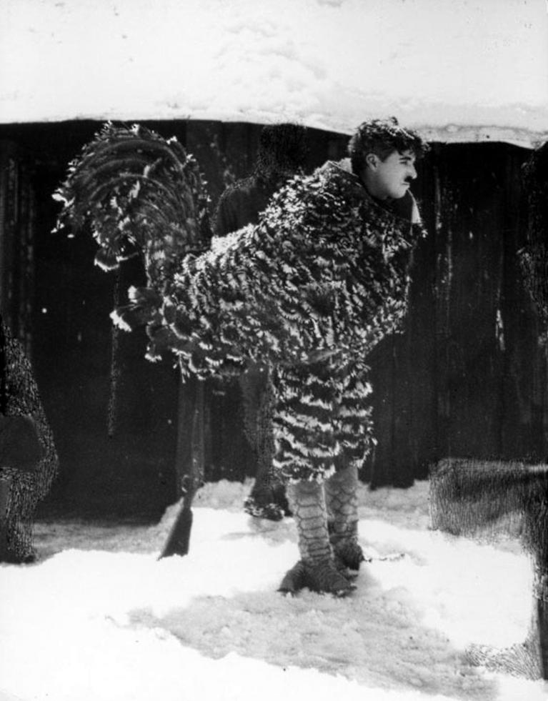 Charlie Chaplin vestito da pollo sul set de "La febbre dell'oro" (1925).