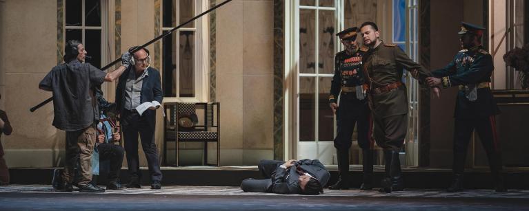 Passiamo al secondo "calibro" dei problemi: l'azione è trasferita al tempo delle purghe staliniane – e fin qui l'operazione è legittima, anche con qualche "correzione" del libretto, persino con qualche trovata che sa di boutade, come la proiezione del faccione di Stalin durante il «Cristo è risorto». Ciò che è invece autolesionista, e certamente non originale, è l'idea di costruire un secondo ulteriore piano drammaturgico per cui tutta la vicenda rappresentata è all'interno di un set cinematografico, in un teatro di posa nel quale, di tanto in tanto (ma nemmeno così spesso) tre sparuti soggetti, un cameraman, un microfonista, un assistente di produzione girano attorno ai cantanti che recitano la loro parte. E tutti gli edifici hanno i loro bravi telai e cantinelle a vista.