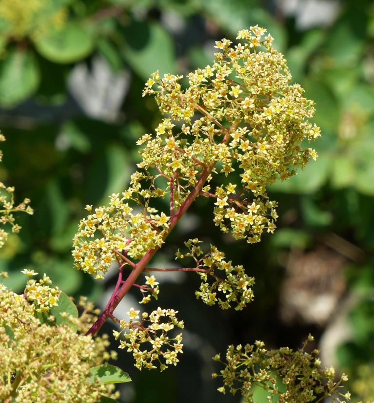 È chiamato anche sommacco selvatico, da non scambiare con il Rhus typhina (americano) o con il Rhus coriaria (siciliano), il sommacco maggiore – della medesima famiglia – ma dalle foglie composte e dalle rigide infruttescenze a pannocchia d’un bel colore amaranto, che permangono all’apice dei rami anche a foglie cadute, e che, nell’oriente prossimo, forniscono un condimento agrumato (sumach), ottimo con il pesce e l’hummus. Entrambi, per l’alto tasso di tannini concentrati soprattutto nelle foglie, venivano usati per la concia dei pellami.