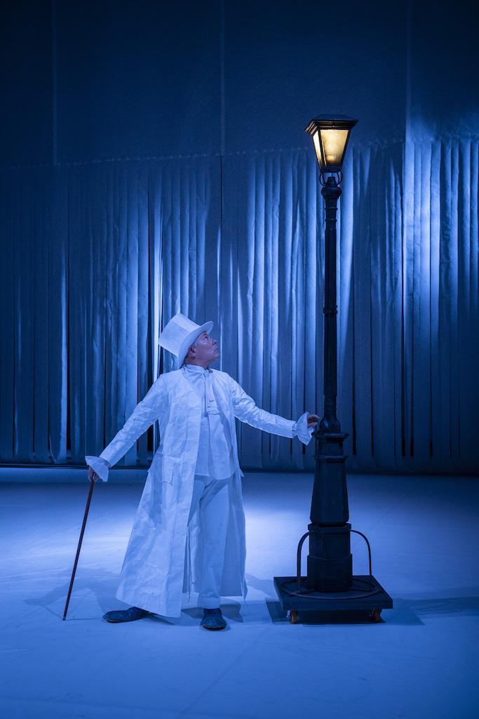 Ora il gioco è rastremato, portato agli elementi essenziali, nel bianco che allarga i confini, rendendo visibile il nulla, il silenzio, e popolandolo di arcoscenici teatrali fatti con lucine da fiera, di passerelle rosse, di fantasmi. Da quello scivolo, spinto da sorridenti Mickey Mouse, sbucano e vengono precipitati nel palcoscenico-mondo gli attori. A uno a uno si confessano: il nome, il segno zodiacale, la nascita della vocazione teatrale: facendo i burattini in casa, o cantando chiusi da soli in una stanza, o a un laboratorio frequentato nell’adolescenza… Un canto del cigno che somiglia a una Via crucis, il pastore errante dell’Asia di Leopardi, la scimmia intelligente da fiera del Woyzeck come maschera dell’uomo (o viceversa), Eduardo e Totò, Nora che vuole scappare dalla sua casa di bambole, Cobelli e Ronconi, un dialogo col vuoto che sembra preso dal Pinocchio di Carmelo Bene, un buffone ormai vecchio e ubriaco nel camerino, smaglianti frac e cilindri di carta come i poveri abiti del figlio di Mastro Geppetto, lampioni che si spostano insieme con lo spleen notturno imbellettati di pallida luna, il sogno di gloria di Enrico V, la danza dinoccolata, slogata e selvaggia dei ciuchini del Paese dei Balocchi, tutti col naso di Pinocchio, o anche senza…
