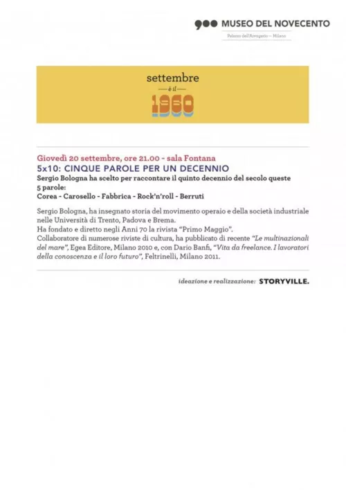 Per un giovedì al mese, nella Sala Fontana del Museo del 900, si potrà partecipare al ciclo di incontri intitolato 5x10 e dedicato all’approfondimento della storia, non solo dell’arte, di ogni singolo decennio del ventesimo secolo.