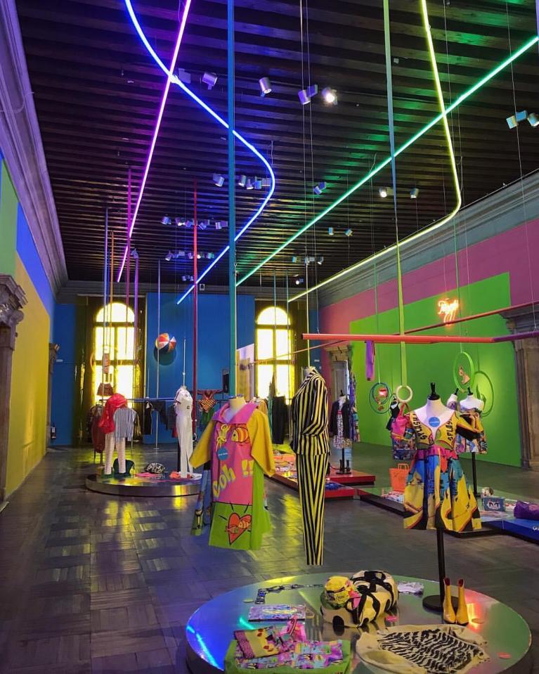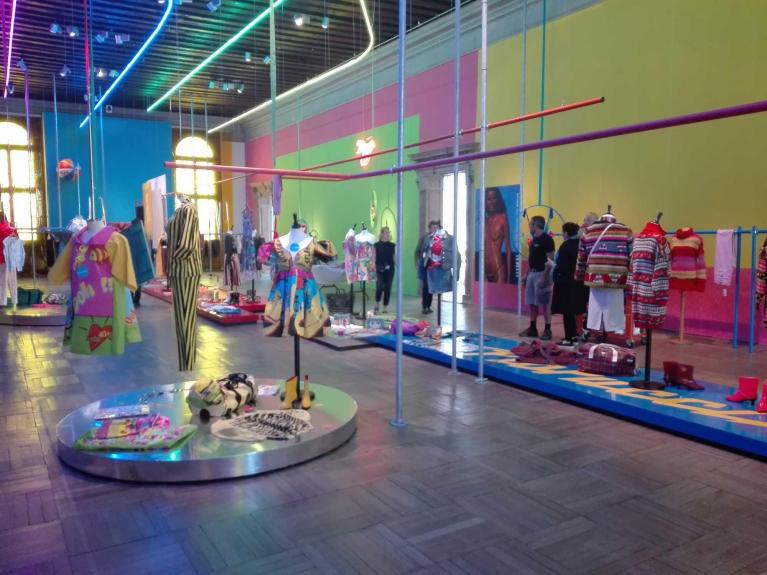 Fiorucci è alla ricerca del punto di rottura con gli schemi della borghesia benestante a cui appartiene, una sorta di missione che lo conduce a trasformare un’attività famigliare dedita al commercio di pantofole in uno dei luoghi del consumo più avanguardisti e visionari, prima in Italia e poi nel mondo. La rivoluzione comincia da un paio di ciabatte di gomma, ornate da un fiore, vendute insieme a degli orecchini en pendant, immediatamente notati dalle due “Anne” del giornalismo di moda italiano, Riva e Piaggi, che decretano il successo dell’idea di Elio, trovatosi improvvisamente a gestire un flusso inusitato di clienti. A Fiorucci interessa divulgare un immaginario o, meglio ancora permeare i suoi spazi con un’atmosfera, cioè un’esperienza affettiva e corporea della moda, immateriale, sapientemente riprodotta dai curatori della mostra – Gabriella Belli e Aldo Colonetti, con Elisabetta Barisoni – nel salone di Ca’ Pesaro, grazie all’utilizzo di luci neon, colori fluo, grafiche cartoon, appenderie fluttuanti, degna cornice per protagonisti dell’universo tematico di Fiorucci, adeguatamente storicizzati, ma non musealizzati, perché l'acme della dinamicità non va imbrigliato nella staticità.