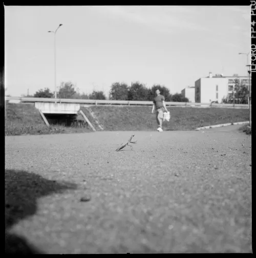 Fu essa ad accorgersi dell’uomo sul fondo in arrivo verso di noi, girando la testa e rimanendo piantata col corpo nella posizione iniziale. La mantide lo seguì con lo sguardo, lo stavo sperimentando in quel momento. Fu allora che scattai l’ultima foto a disposizione nel rullo di pellicola. Riuscii anche a fotografarla tre volte mentre ancora fissava me.