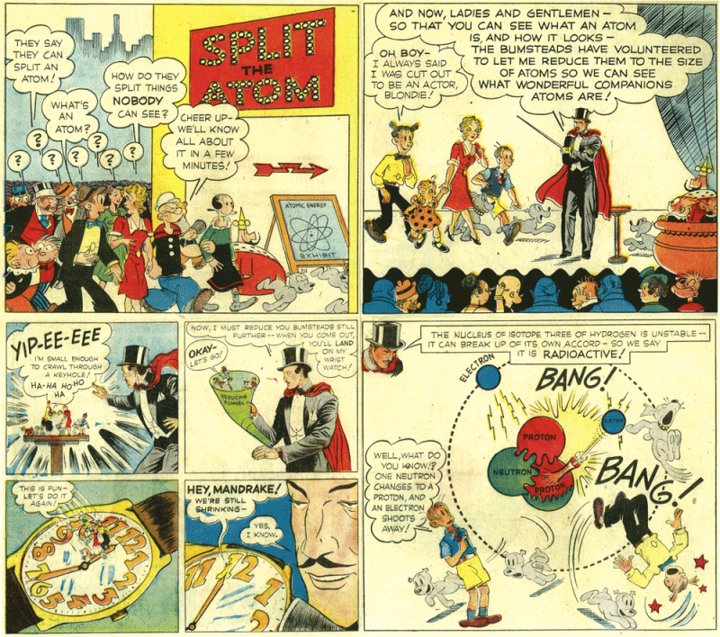 Le istruzioni erano affidate a un libretto a fumetti (Learn How Dagwood Split the Atom) con la coppia dei personaggi Blondie e Dagoberto, esempio di tradizionale famiglia americana, che partecipavano a una conferenza tenuta dal mago Mandrake su come sono fatti gli atomi, come si separano e cosa li fa esplodere. La coppia era magicamente ridotta a dimensioni sub-atomiche per poter osservare da vicino il comportamento dei vari componenti: neutroni, protoni ed elettroni. Il fumetto vantava nientemeno che una introduzione del generale Leslie Groves, responsabile militare, all’epoca in pensione, del Progetto Manhattan, quello che aveva messo a punto le bombe atomiche sganciate su Hiroshima e Nagasaki, e del fisico nucleare John R. Dunning. Praticamente un’associazione a pop-delinquere.