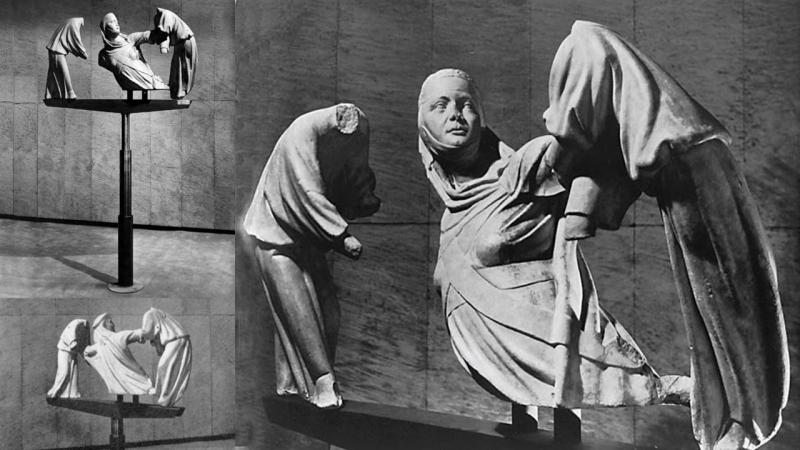 "Le sculture non erano né di legno, né di marmo, ma erano tutte di gesso, materiale amorfo che soffre solo delle intemperie e dell'umidità e quindi poteva benissimo essere esposto al sole." (in Franca Semi, A lezione con Carlo Scarpa, pag. 189)